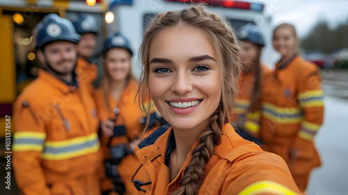 Group of emergency responders posing happily for a selfie.