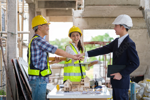 Group of engineer and architect stacking hands to celebrate successful project at construction site.