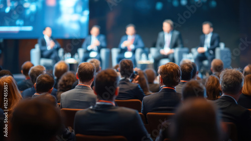 Group of executives attending panel discussion, diverse business speakers on stage, spotlight on main presenter, formal business meeting setup