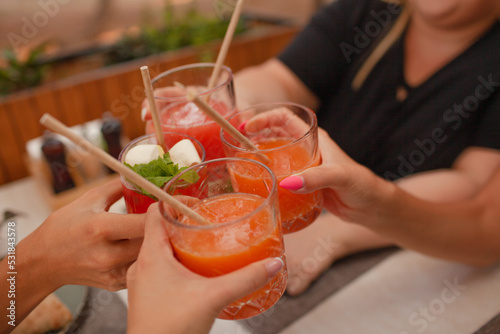 Group of female friends, plus size with thin girls sit in cafe and drink the drinks.