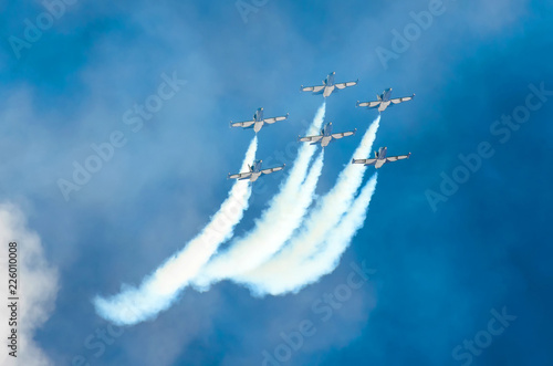Group of fighter jet planes fly and leave behind a white smoke trail.