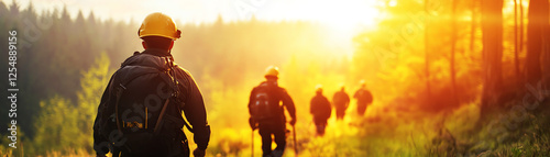 Group of firefighters walking through forest during sunset, bathed in warm sunlight.