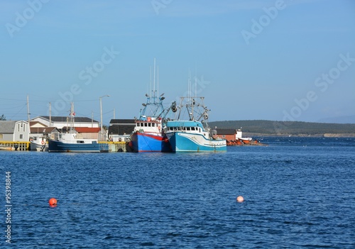 group of fishing vessels anchored at the pier at Frenchman's Cove, Newfoundland Canada