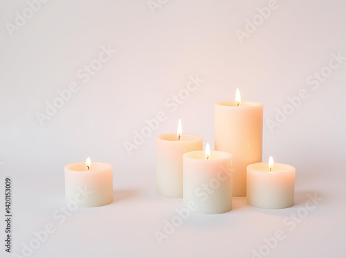 Group of Five Softly Glowing Cream-Colored Pillar Candles on a Light Background