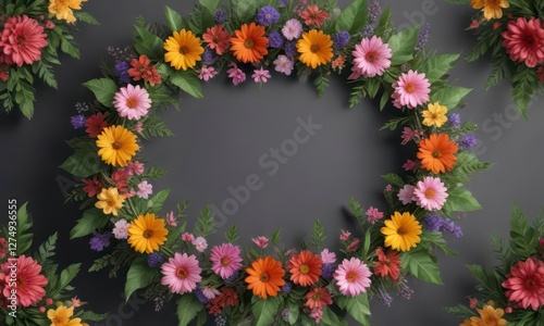 Group of flowers arranged in a circular pattern, with leaves and stems in the background, earthy, beauty, flowers