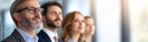 Group of focused business professionals looking up, representing leadership, success, and teamwork in a modern office environment.