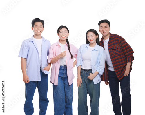 Group of four cheerful young adults dressed in casual clothing posing on a white background