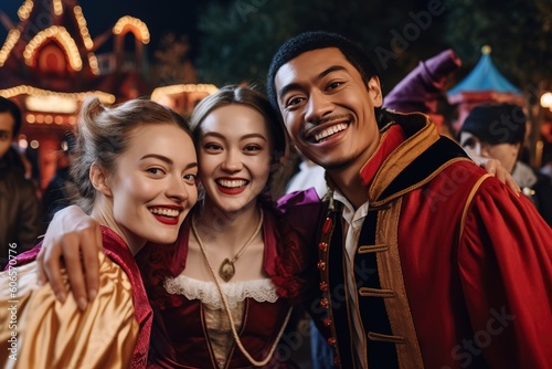 Group of friend wearing costumes in outdoors carnival for Halloween night. Generative AI