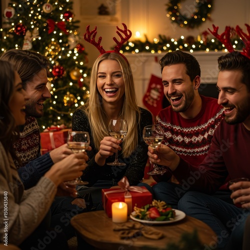 Group Of Friends Celebrating Christmas With Wine And Joyous Cheers