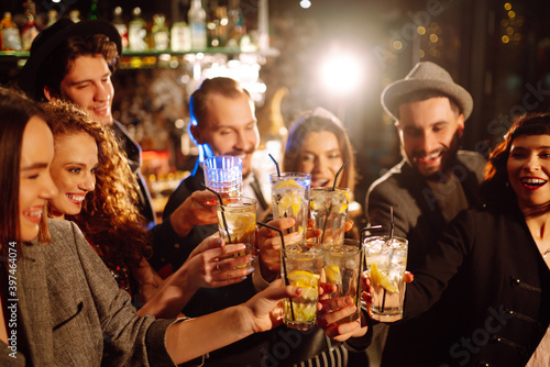 Group of friends cheering and drinking cocktails together at the bar. Young people celebrating winter holiday together with coctails at a nightclub party. Youth, lifestyle, drink, birthday concept.