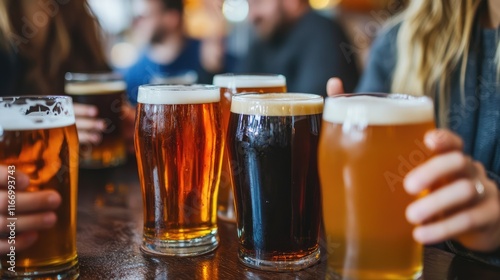 Group of friends drinking beer at brewery pub restaurant - Happy people enjoying happy hour sitting at bar table - Close-up image of brew glasses - Food and beverage lifestyle concept.