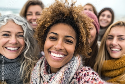 Group of friends enjoying a cheerful day at the beach during a chilly afternoon in autumn while wearing cozy sweaters