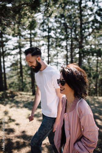 Group of friends hiking through the forest