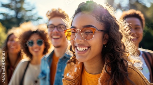 Group of friends laughing and enjoying each other's company in a sunny outdoor setting