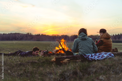 Group of friends on a picnic by the campfire.
