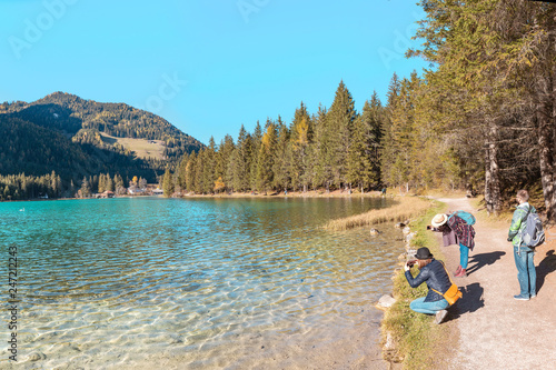 Group of Friends travelers having fun on their vacation in Italian Dolomites Mountains. Dobbiaco lake
