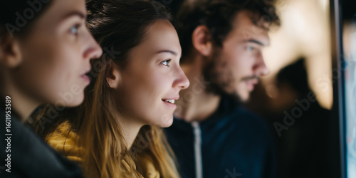 Group of friends visiting city museum, enjoying interactive exhibit, learning, smiling, focused, indoor, youthful