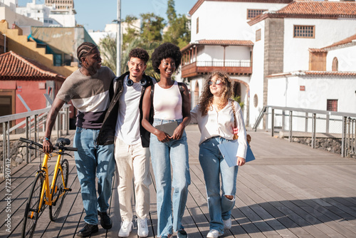 Group of friends walking together on the way to college. Concept: studies, education, friendship