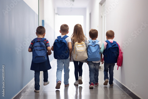 Group of girls and boys at school, back view. Generative AI