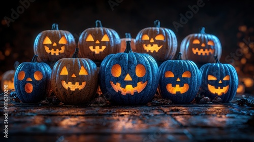 Group of glowing jack-o'-lanterns with various carved faces arranged in a spooky Halloween display at night Generative AI