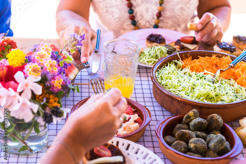 Group of hands sharing food and drink. Caucasian peoples enjoying brunch or meal together. Fruits and vegetables on the wooden table. Sunlight outdoor on the terrace