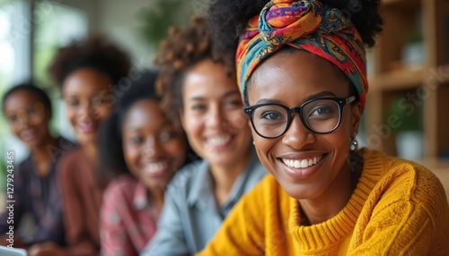 Group of happy diverse women. African american female in glasses smiles. Concept of inclusion, equal opportunity, representation, diversity, support in workplace, respect and collaboration.
