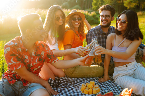 Group of happy friends cheers and drink beers on in summer park. Vacation, picnic, friendship or holliday concept.