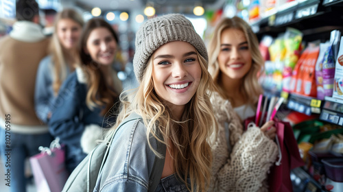 Group of happy friends shopping in store.