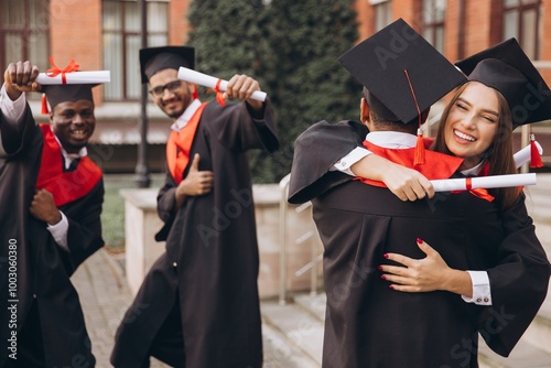 Group of Happy Graduates Celebrating in Cap and Gown Holding Diplomas Outdoors