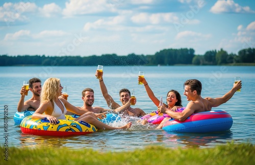 Group of happy people enjoy swimming and sipping cold drinks while floating on colorful tubes during sunny summer day