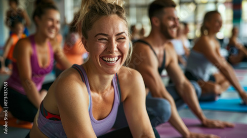 Group of Happy People Enjoying a Fun Yoga Class Indoors