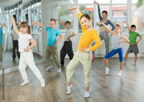 Group of happy preteen children with female teacher practicing hip hop in modern dance studio