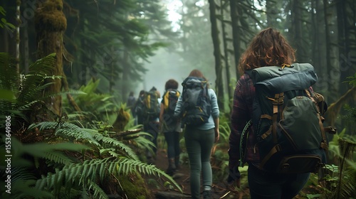 Group of hikers traverses a misty forest trail wearing backpacks through lush ferns and tall trees