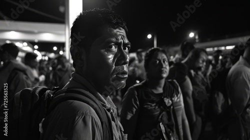 group of immigrants waiting at a crowded border checkpoint with anxiety