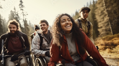 Group of joyful friends hiking in the forest, enjoying outdoor activities together.