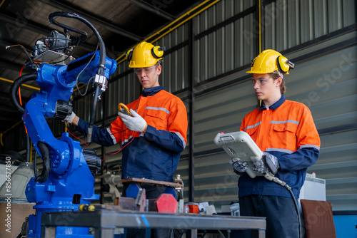 group of male engineer workers maintenance automatic robotic arm machine in a dark room factory. worker checking and repairing automatic robot hand machine. Worker wearing safety glasses and helmet.