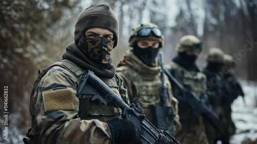 Group of masked individuals in camouflage clothing standing in rugged terrain with weapons, symbolizing resistance and rebellion, strong determined expressions.