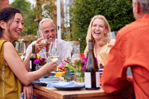Group Of Mature Friends Talking Around Table At Summer Dinner Party In Garden At Home