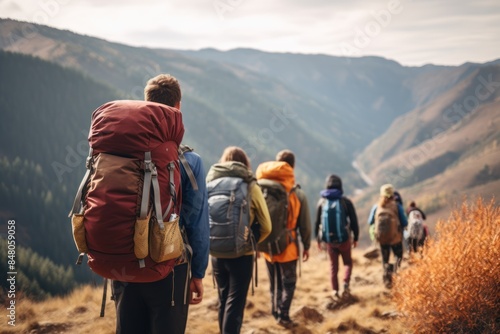 Group of men and women hikers with backpacks looking into the distance during hiking