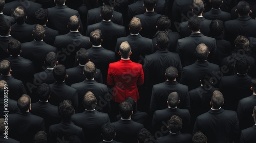 Group of men in black suits with one man in a red jacket standing out in a crowd during a corporate event in an urban setting