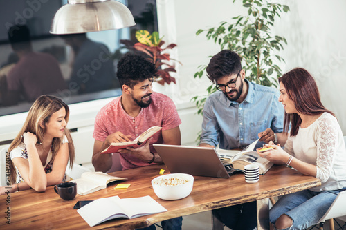 Group of multi ethnic young students preparing for exams in home interior.