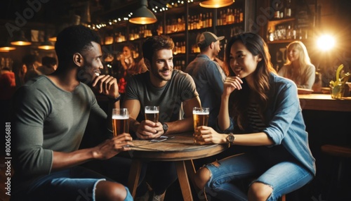 Group of multicultural friends sharing a laugh over pints of beer at a cozy pub.