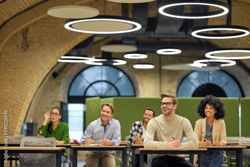 Group of multiracial business people sitting in the modern office and listening to coach or speaker during corporate seminar