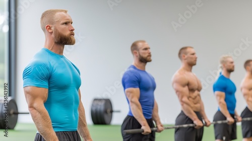 Group of muscular men performing deadlifts in a modern gym with weights in the background