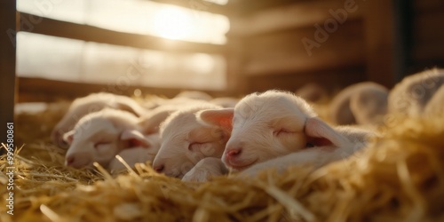 Group of Newborn Lambs Peacefully Sleeping on Straw in a Sunlit Barn