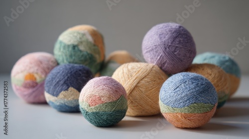 Group of nine balls of yarn arranged in a scattered manner on a grey surface. the balls are of different colors and sizes, with some being pink, blue, green, yellow, orange, and purple.