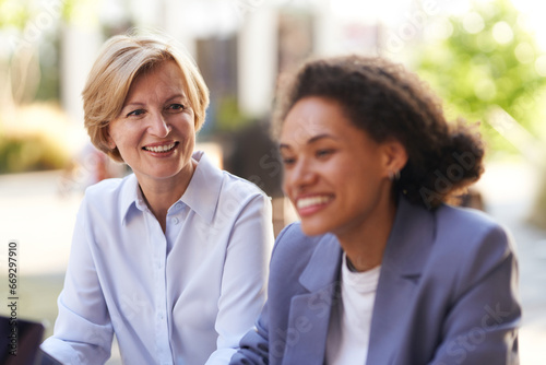 Group of office workers working on the terrace of the office. Teamwork concept