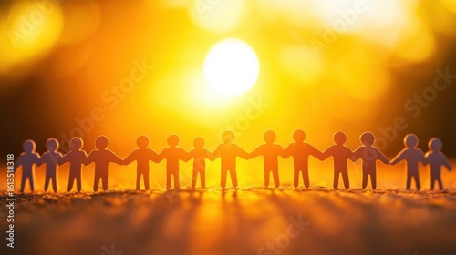 Group of paper cutouts holding hands in a beautiful sunset, symbolizing unity, friendship, and togetherness in a serene outdoor environment
