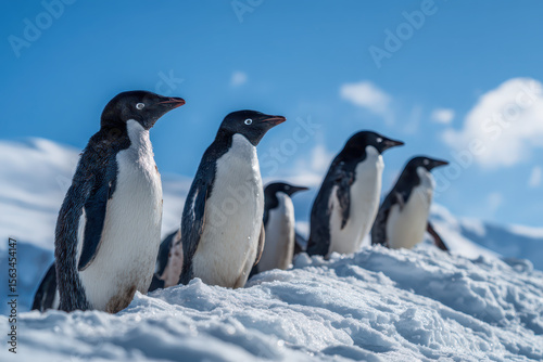 Group of Penguins Standing on Snow Covered Hill Beautiful Winter Scene