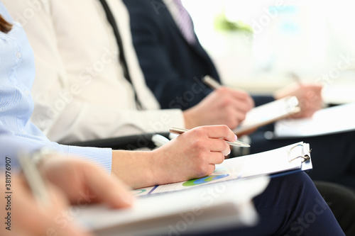 Group of people clap their arm in row during seminar closeup. Great news brief achievement win deal good job happy birthday employee introduce party positive welcome effective speech concept